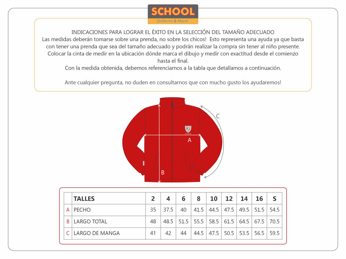 Campera confeccionada en micro-polar doble, anti-peeling; con cierre y cuello alto.  Posee bolsillos y el escudo institucional bordado.  Es una prenda liviana y resistente, ideal para el uso de los chicos y su lavado y secado son muy rápidos.