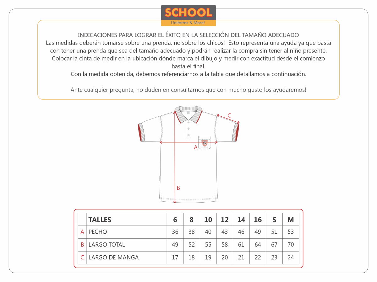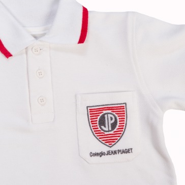 Remera de piqué con cuello tipo "polo", unisex.  La tela blanca tiene filtro UV para proteger la piel de los niños.  El filtro UV no se pierde con los lavados. El cuello, los  puños y accesorios de bolsillos realizados en tejido de punto (algodón-acrílico),  no decoloran ni modifican su formato.  Los botones están reforzados y todas las prendas tienen un botón de repuesto en su interior.  En todas nuestras prendas encontrarán una etiqueta dónde colocar los datos personales.