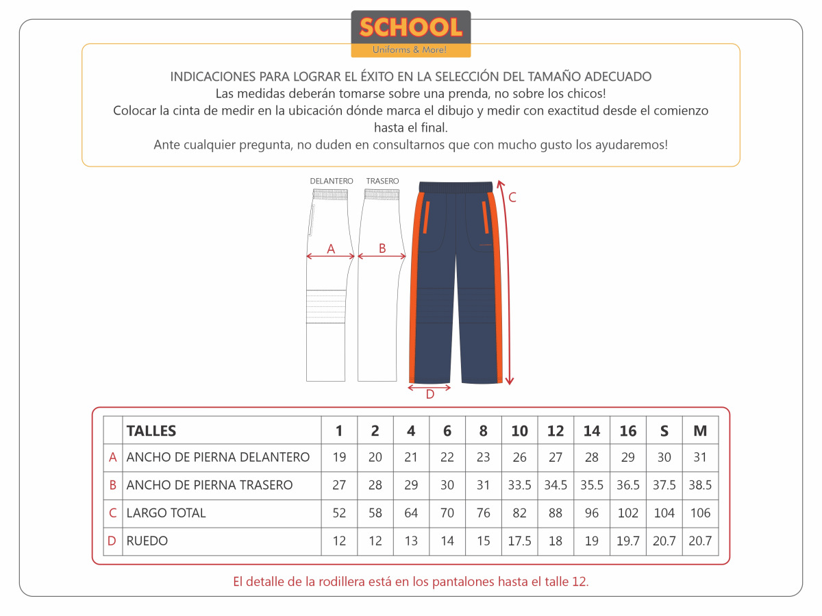 Los pantalones llevan rodillera exclusivamente hasta el talle 12 inclusive.