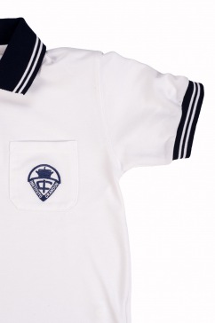 Remera de piqué con cuello tipo "polo", unisex.  La tela blanca tiene filtro UV para proteger la piel de los niños.  El filtro UV no se pierde con los lavados. El cuello, los  puños y accesorios de bolsillos realizados en tejido de punto (algodón-acrílico),  no decoloran ni modifican su formato.  Los botones están reforzados y todas las prendas tienen un botón de repuesto en su interior.  En todas nuestras prendas encontrarán una etiqueta dónde colocar los datos personales.
