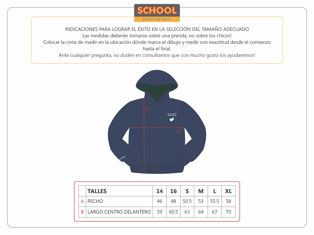 Canguro con capucha con bolsillo delantero.  La prenda es toda de color azul marino (exactamente igual al pantalón deportivo), con el logo institucional y la capucha forrada en color verde inglés.